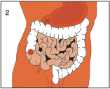 Цекостома (рис.2) также располагается в правой подвздошной области, выводится слепая кишка. Поскольку она следует непосредственно за тонкой кишкой, то из цекостомы многократно за сутки выделяется жидкий кал.