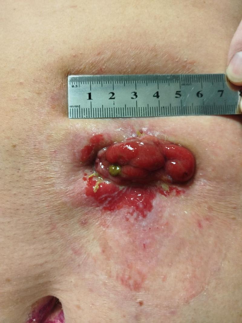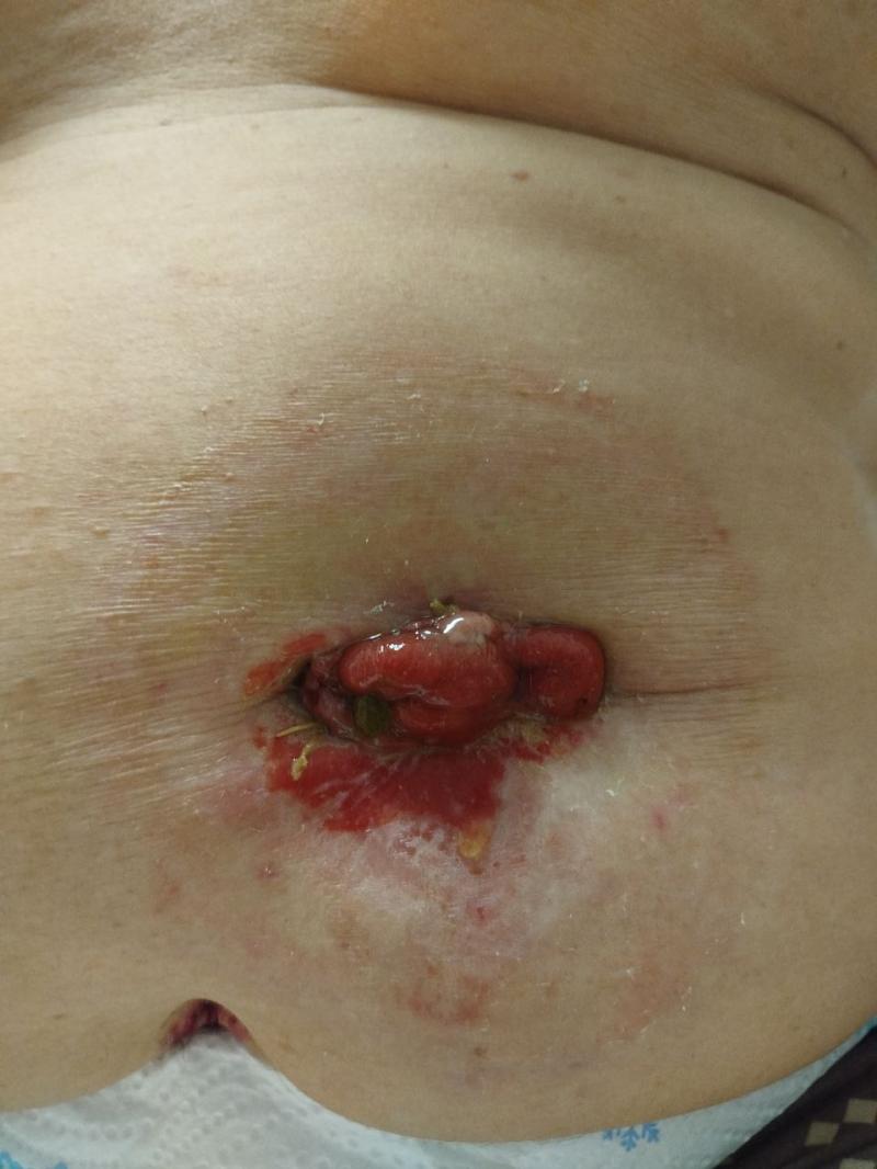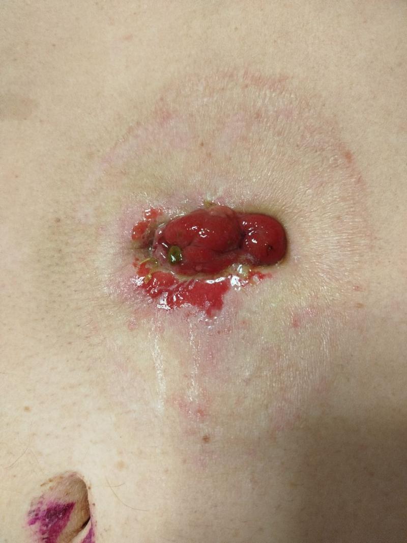 Судя по предоставленным фото, стома втянута, осложненная перистомальным дерматитом, так называется повреждение кожи вокруг стомы. Конечно, очная консультация более целесообразна.