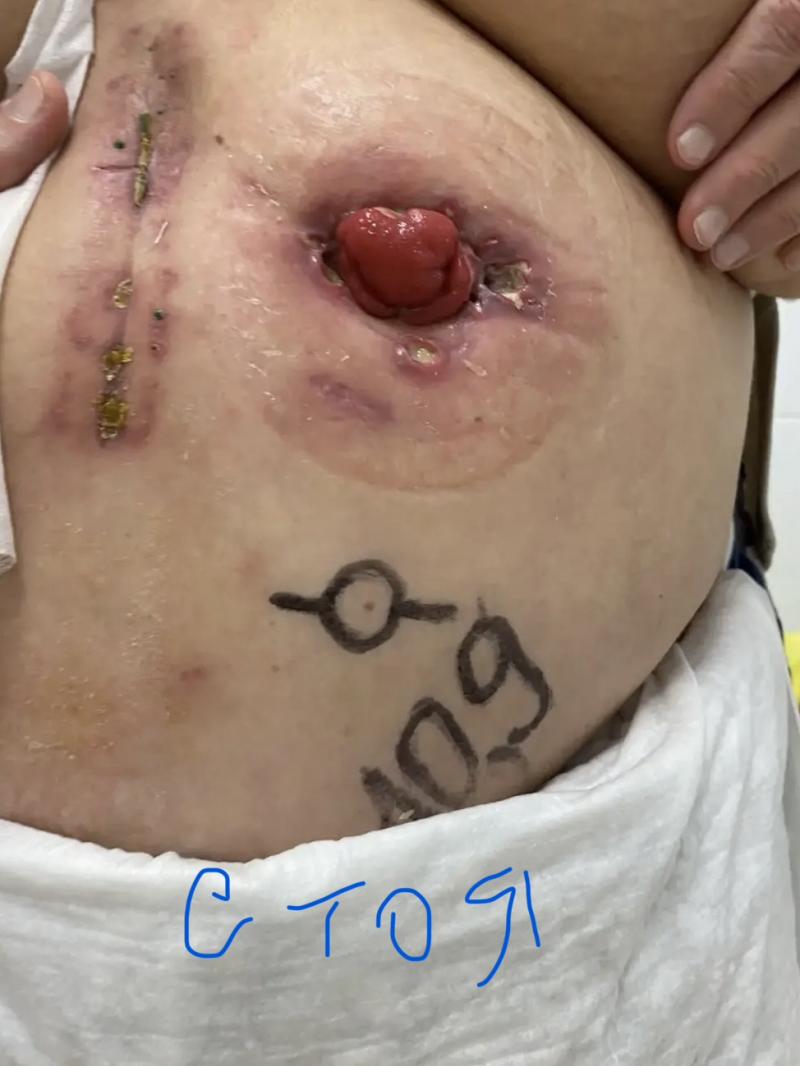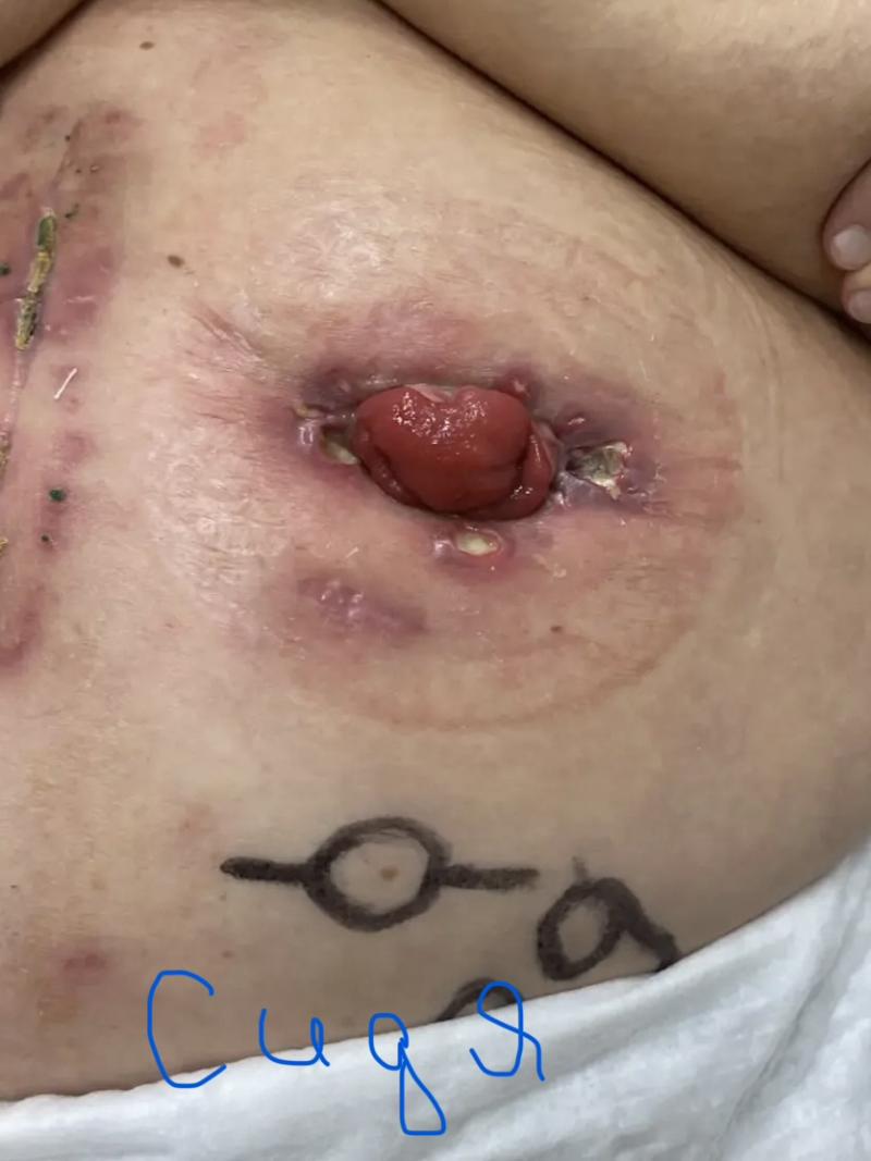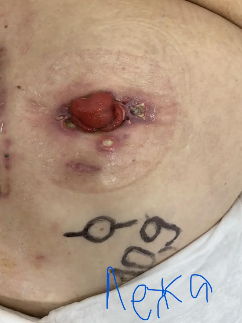 Здравствуйте!!! Моей маме (76 лет) в связи с раком прямой кишки вывели колостому, сейчас она находится на лучевой терапии. Вопрос по уходу за стомой в связи с образованием вокруг нее воспаления и язв. Два дня назад хирург удалил нитку. Фото прикладываем. Пользуемся однокомпонентным калоприемником Coloplast 175000, очищающей жидкостью, защитным кремом, защитной пленкой, герметиком - все производства Coloplast. На язвы наносим банеоцин. Дополнительно промываем хлоргексидином и раствором Пронтосан. Какие средства можно использовать в нашей ситуации? Можно ли герметик наносить на язвы? Правильный ли калоприемник мы используем?