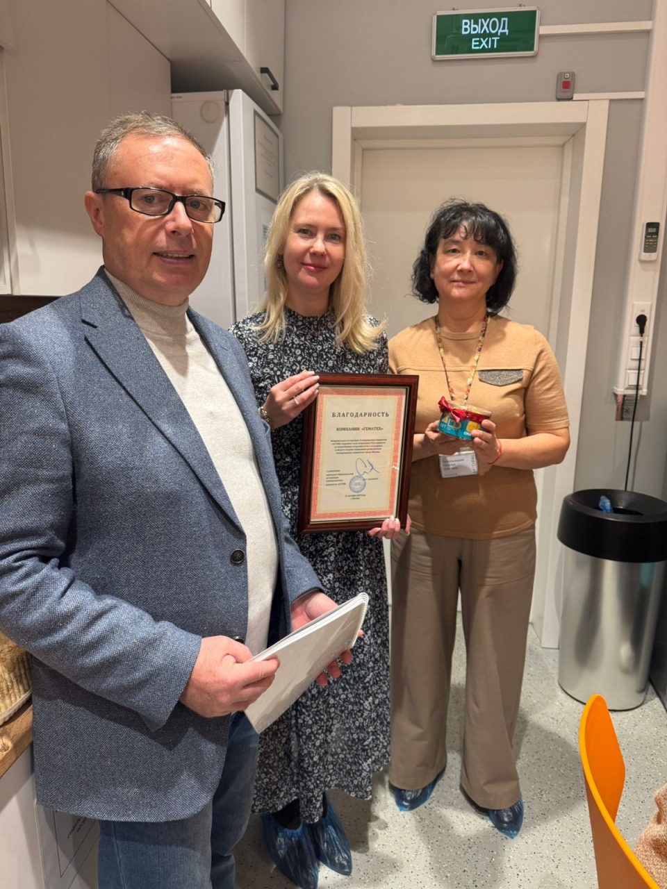 Суханов В.Г. вручил руководству «ГемаТех» благодарственную грамоту от ассоциации «АСТОМ» и также подарки сотрудникам и присутствующим участникам мероприятия. Отдельной благодарностью была отмечена руководитель Службы социокультурной реабилитации ассоциации «АСТОМ» Швецова Л.А., как один из организаторов мероприятия.