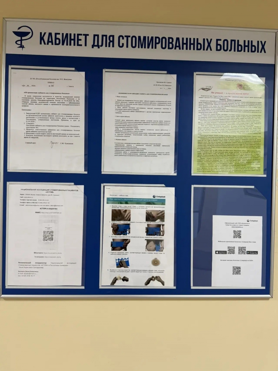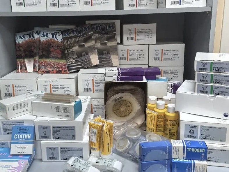 Для начала работы кабинета для стомированных больных, конечно, понадобились целевые наглядные информационные материалы, разнообразные образцы медицинских изделий, необходимые в подборе и обучении ими пользоваться для стомированных пациентов. В этом также кабинет получил поддержку от производителей средств ухода за стомой «Колопласт» и ГемаТех». Специально подобранными информационными материалами и небольшим количеством средств ухода за стомой поделилась Национальная ассоциация больных с нарушениями функций экскреторной системы «AСТОМ». Желаем Кабинету для стомированных больных успешной работы!