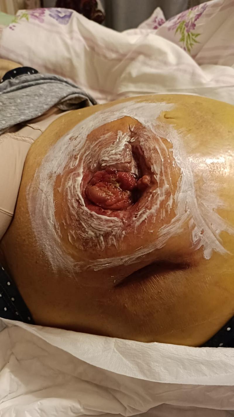 Вы не написали, какая у пациентки стома, по какому поводу, когда была сформирована. Фото, насколько я понимаю, сделано в положении пациентки лежа. этого недостаточно.
