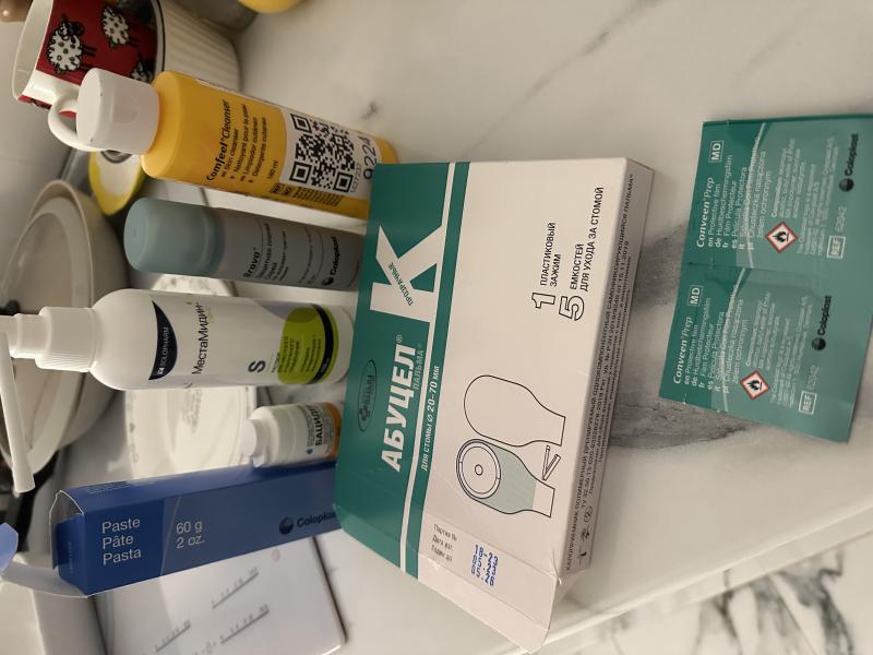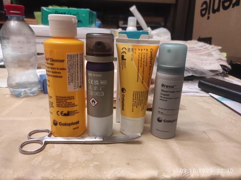 Здравствуйте! В ответ на полученное сообщение Хочу уточнить что первая фотография была сделана в положении пациентки лёжа сейчас высылаю фотографию в положении сидя также можно оценить динамику кожных высыпаний К сожалению она отрицательная.Поскольку илиостома была выведена только 2 октября Я так понимаю что двухкомпонентные калоприёмники мы пока не можем использовать поскольку у нас не установился ещё размер самой стомы. Текущий размер 45 мм. При первом применении калоприёмника как раз когда всё протекло в больнице никакие специальные средства не наносились. Сейчас мы снимаем калоприёмник очищаем специальным очистителем кожу затем наносим пудру затем её сдуваем наносим специальный защитный крем потом вторую кожу после того как крем впитается (остатки убираем) потом вокруг стомы наносим герметик и только потом приклеиваем кольцо. Раньше мы действительно приклеивали калоприёмник в положении лёжа нас так научили в больнице но сейчас в последний раз приклеили в положении сидя. Мы используем дренируемые однокомпонентные калоприёмники фирмы Coloplast модель 17500. Большое спасибо за рекомендации по диете. Высылаю фото текущего состояния стомы в положении сидя (белые на фотографии это не гной а остатки герметика которые не смыть никак ничем, даже антиклеем). А также фото средств которые мы применяем.